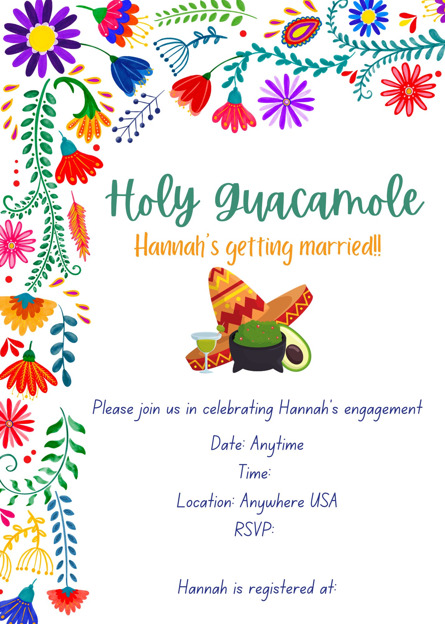Holy Guacamole Bridal Shower Invitation, the design showcases a lively and colorful layout with playful Mexican-themed illustrations and a festive floral border. Perfect for bridal showers, engagement parties, or any celebratory gathering, this editable template allows you to customize all text details—such as the name, date, time, and location—directly in Canva. Once personalized, simply download and print at home or through your favorite print service for a vibrant, ready-to-send invitation.