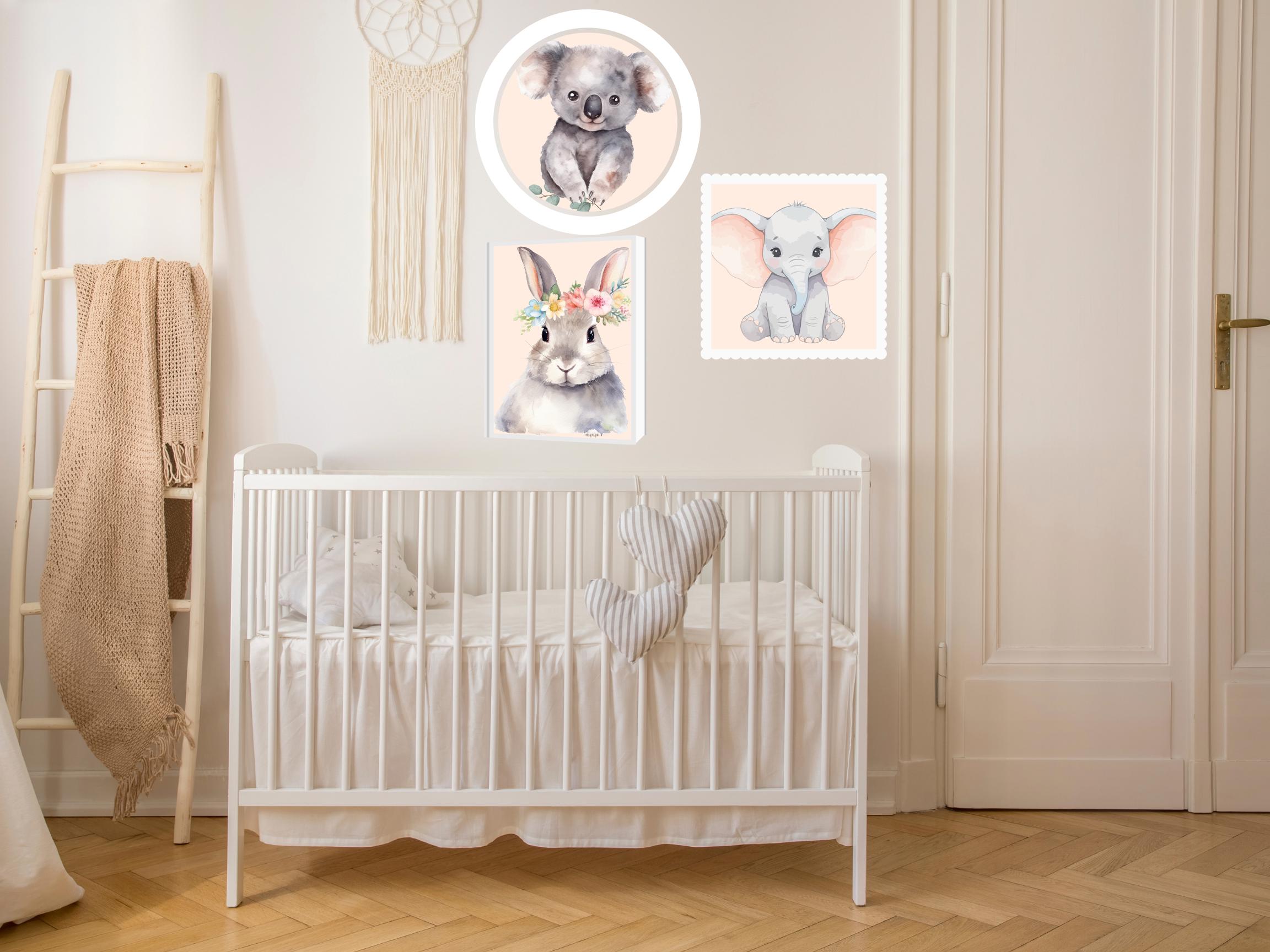 The trio of watercolor animal prints—a koala, bunny, and elephant—adds a touch of whimsy and warmth. Each piece features gentle pastel hues and soft brushstrokes, making them ideal for a baby’s room. The floral crown on the bunny introduces a subtle pop of color, while the koala and elephant bring a sense of calm and comfort. These prints not only decorate the walls but also spark imagination and storytelling as the child grows.
