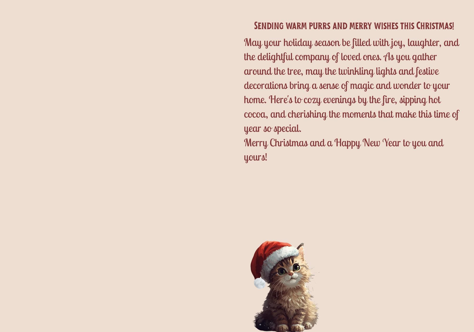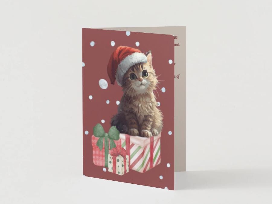 Make hearts melt this Christmas with the sweetest card around! Featuring an adorable kitten in a Santa hat perched on beautifully wrapped gifts, this design captures the cozy magic of the season.
