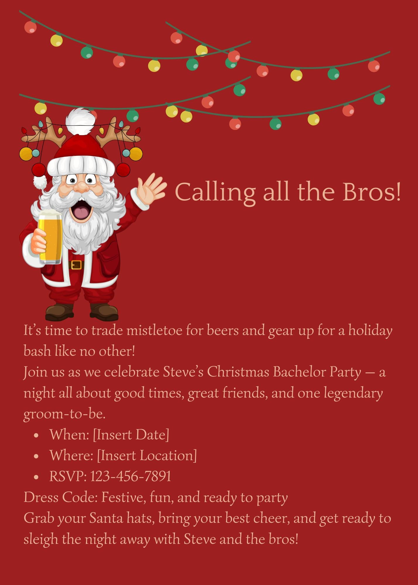 If his bachelor party falls during the most wonderful time of the year, make it unforgettable with this Christmas Bachelor Party Invitation — the perfect mix of festive fun and bachelor bash energy!
