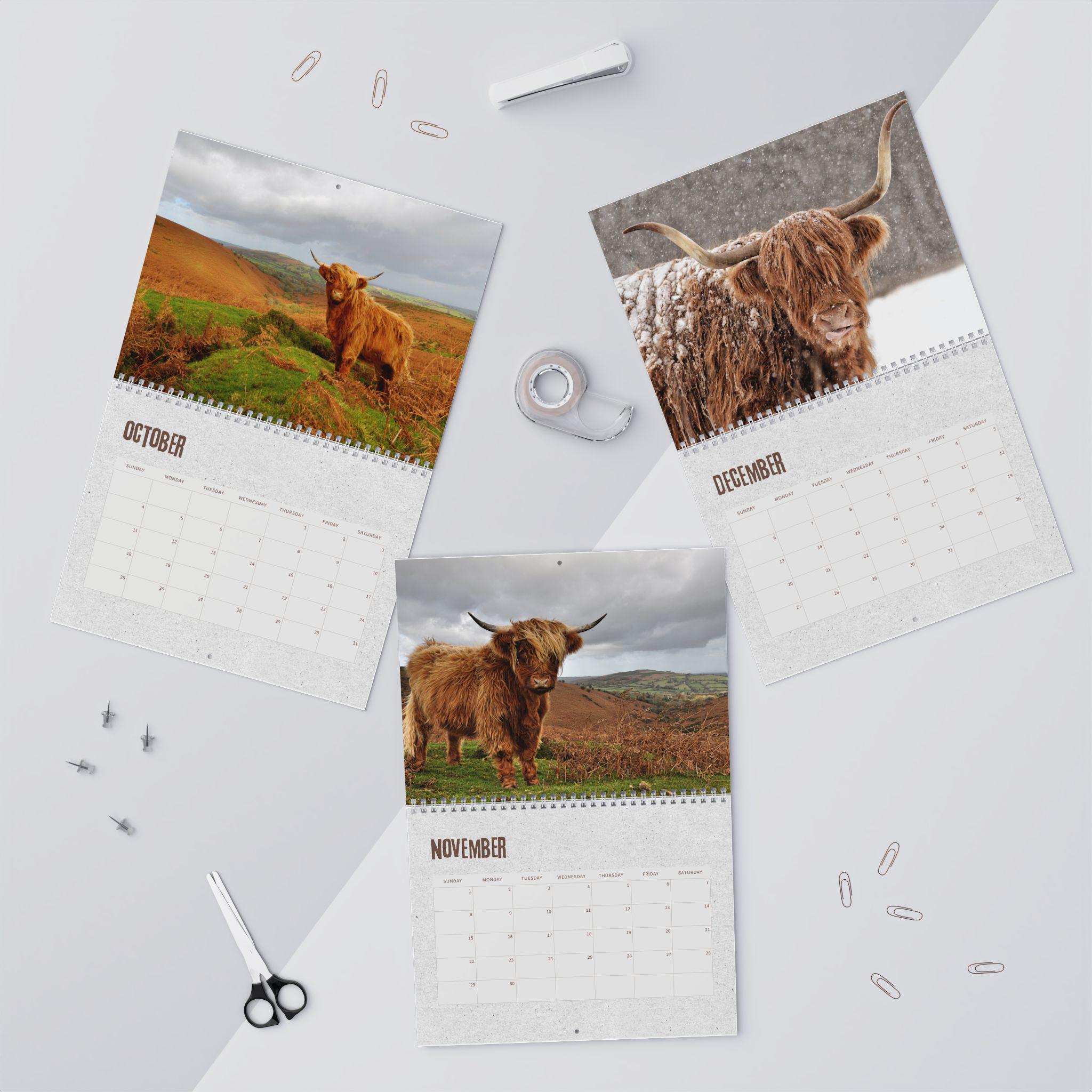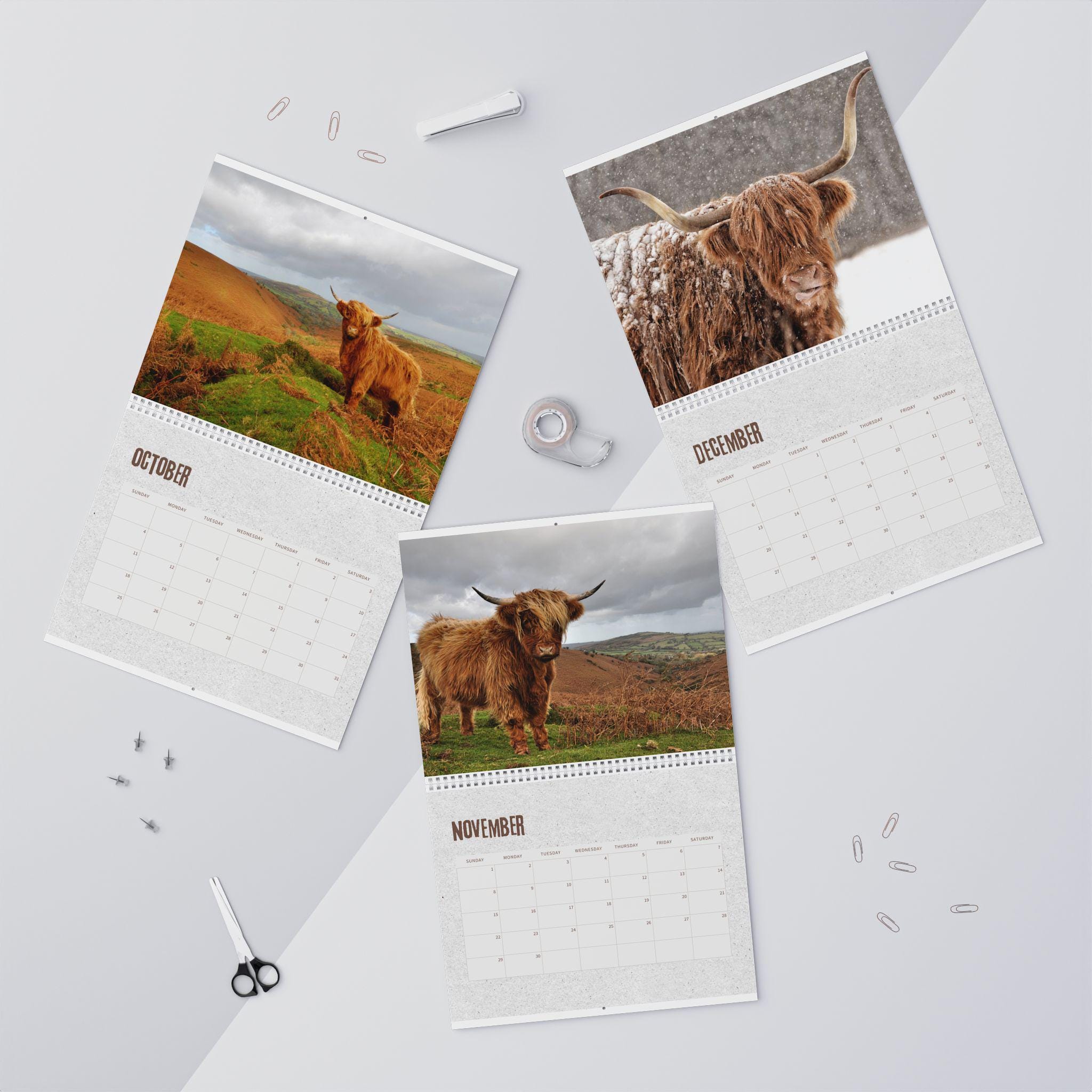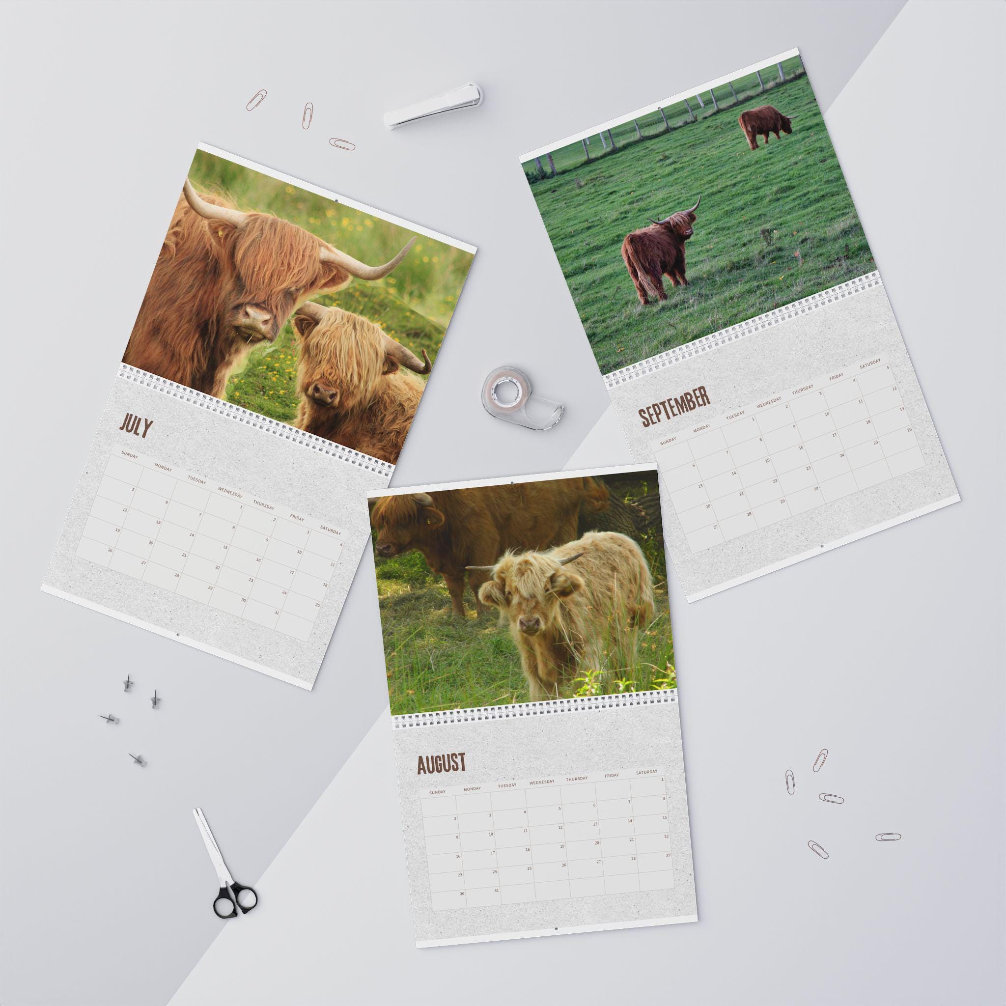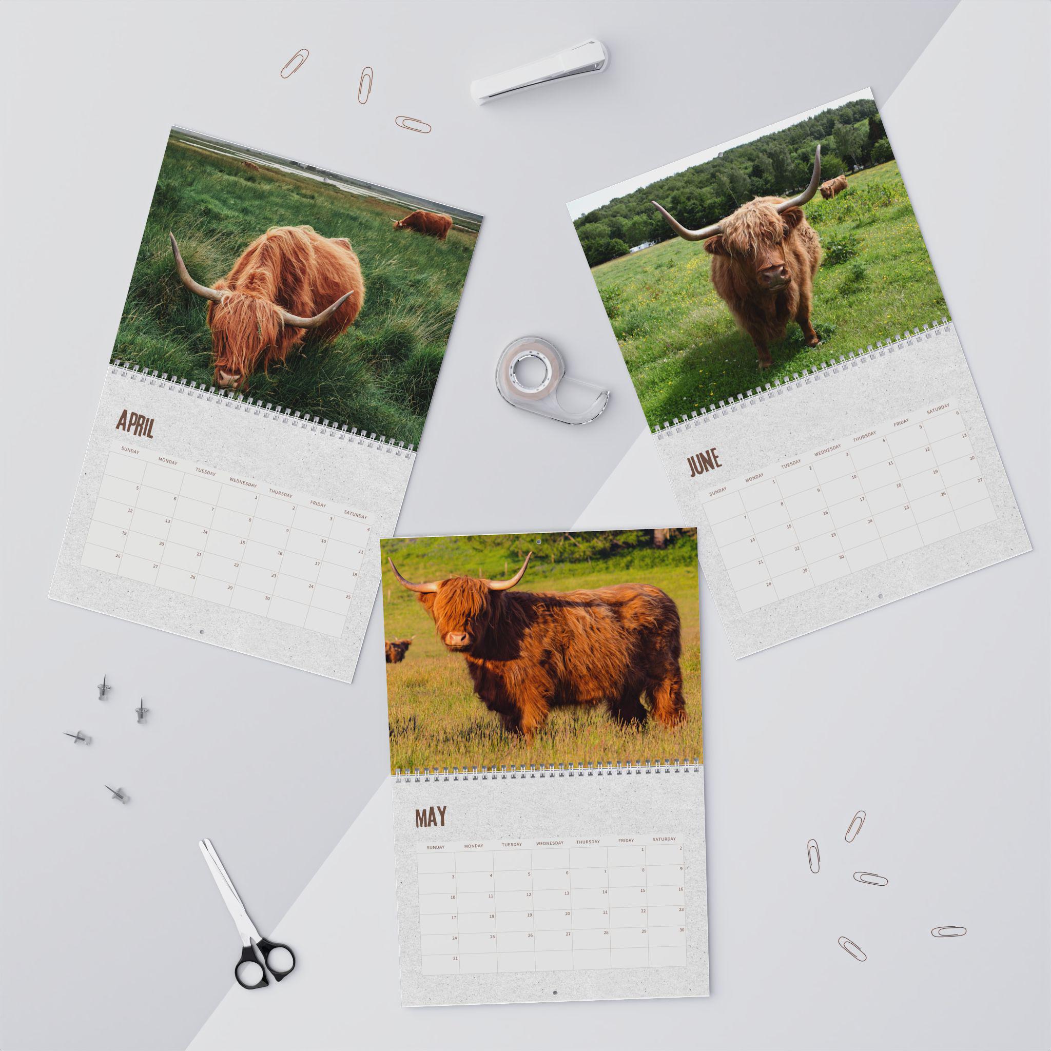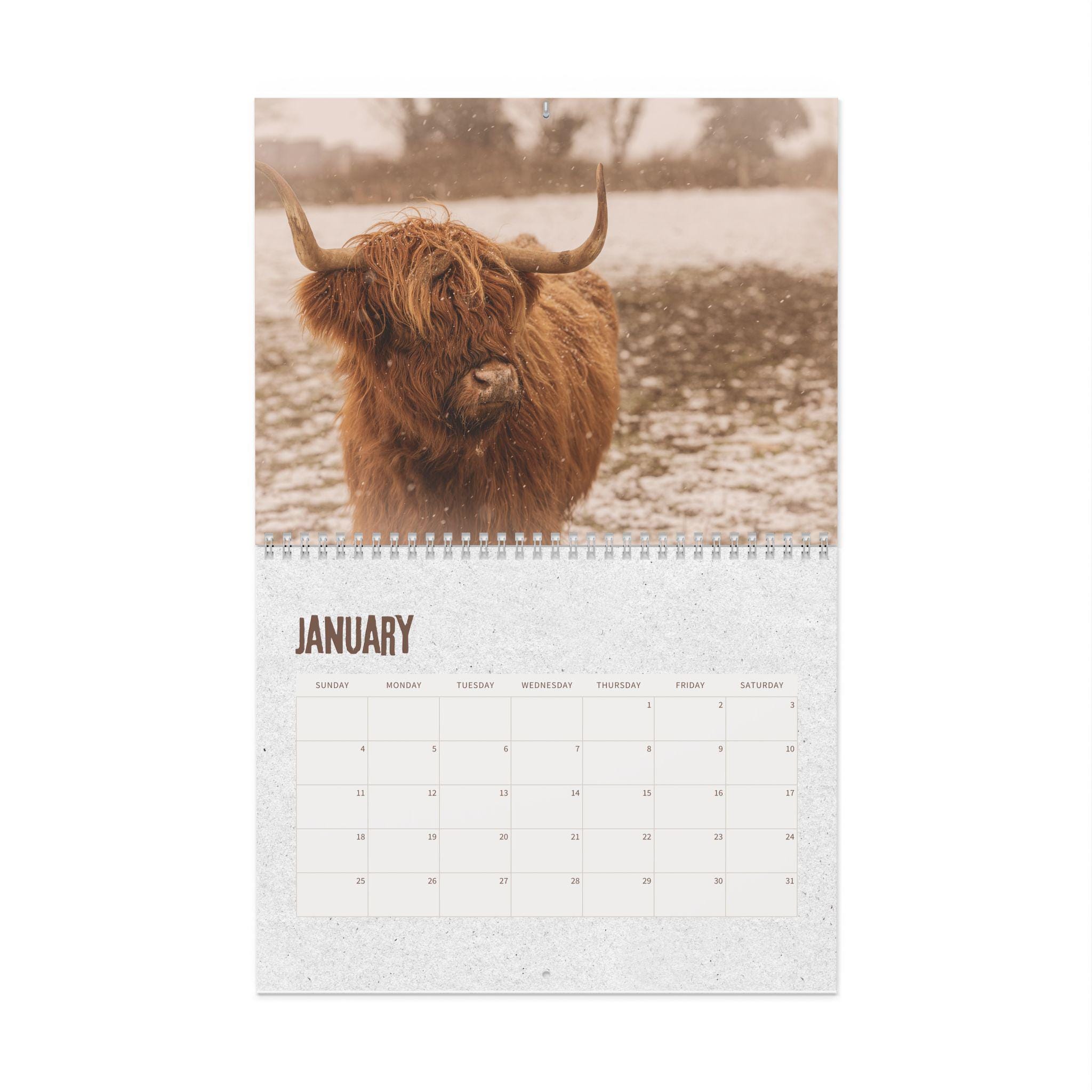 Each month showcases a unique Highland cow image — from snowy winter landscapes to sunny summer pastures — making it the perfect gift for animal lovers, farmers, or anyone who adores cozy, nature-inspired decor. The clean layout includes all major dates and plenty of space for notes, helping you stay organized while enjoying a bit of Highland cheer every day.