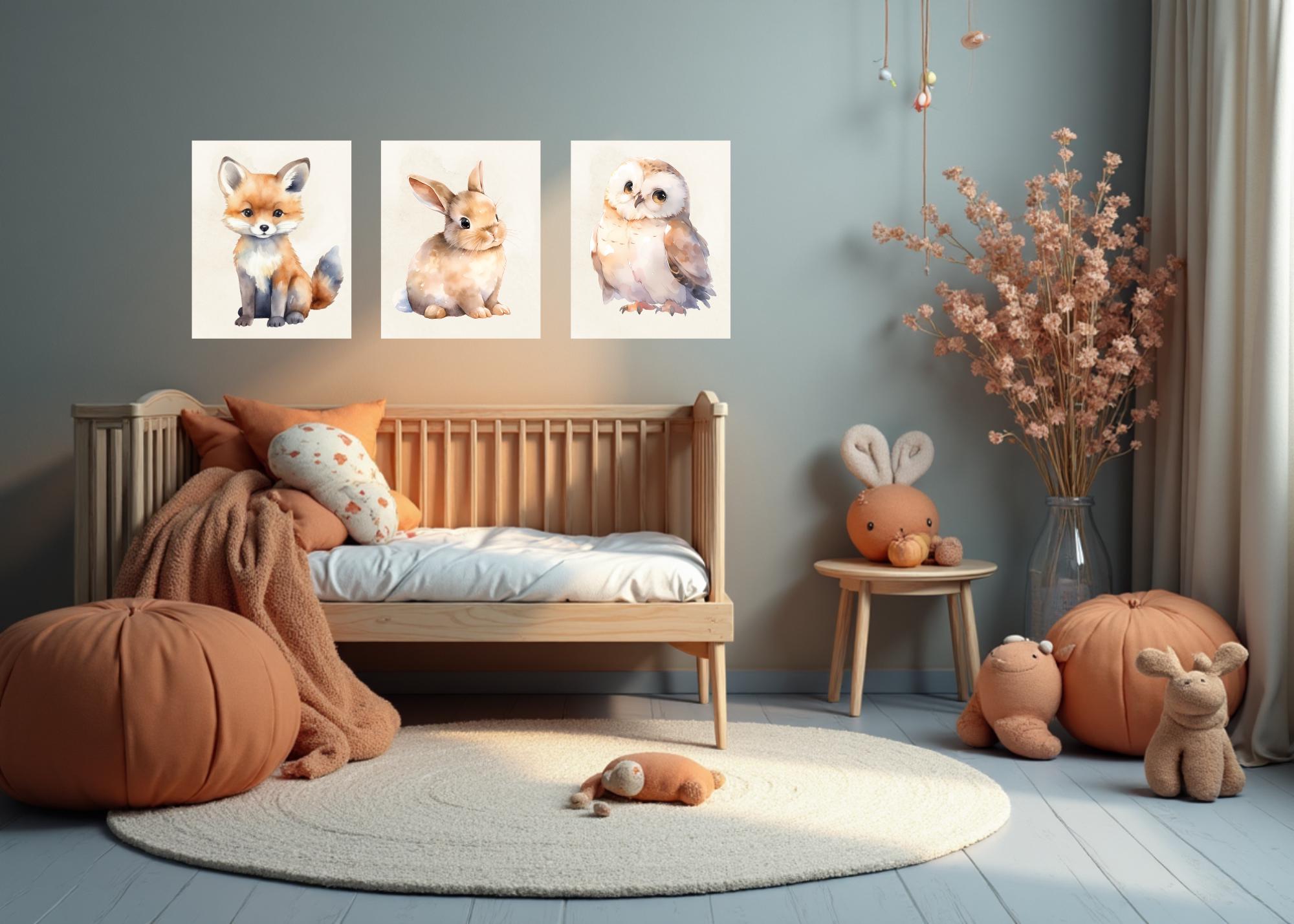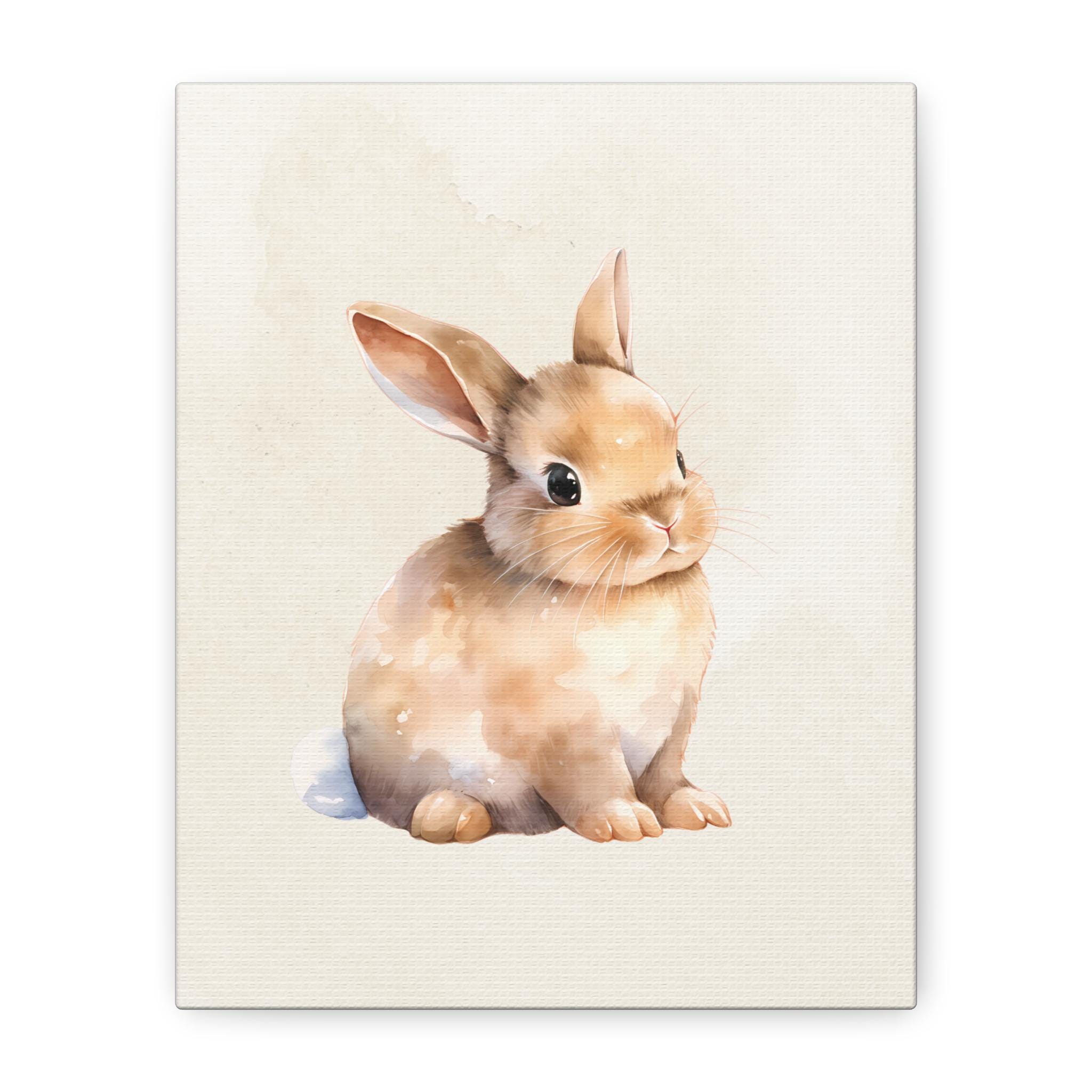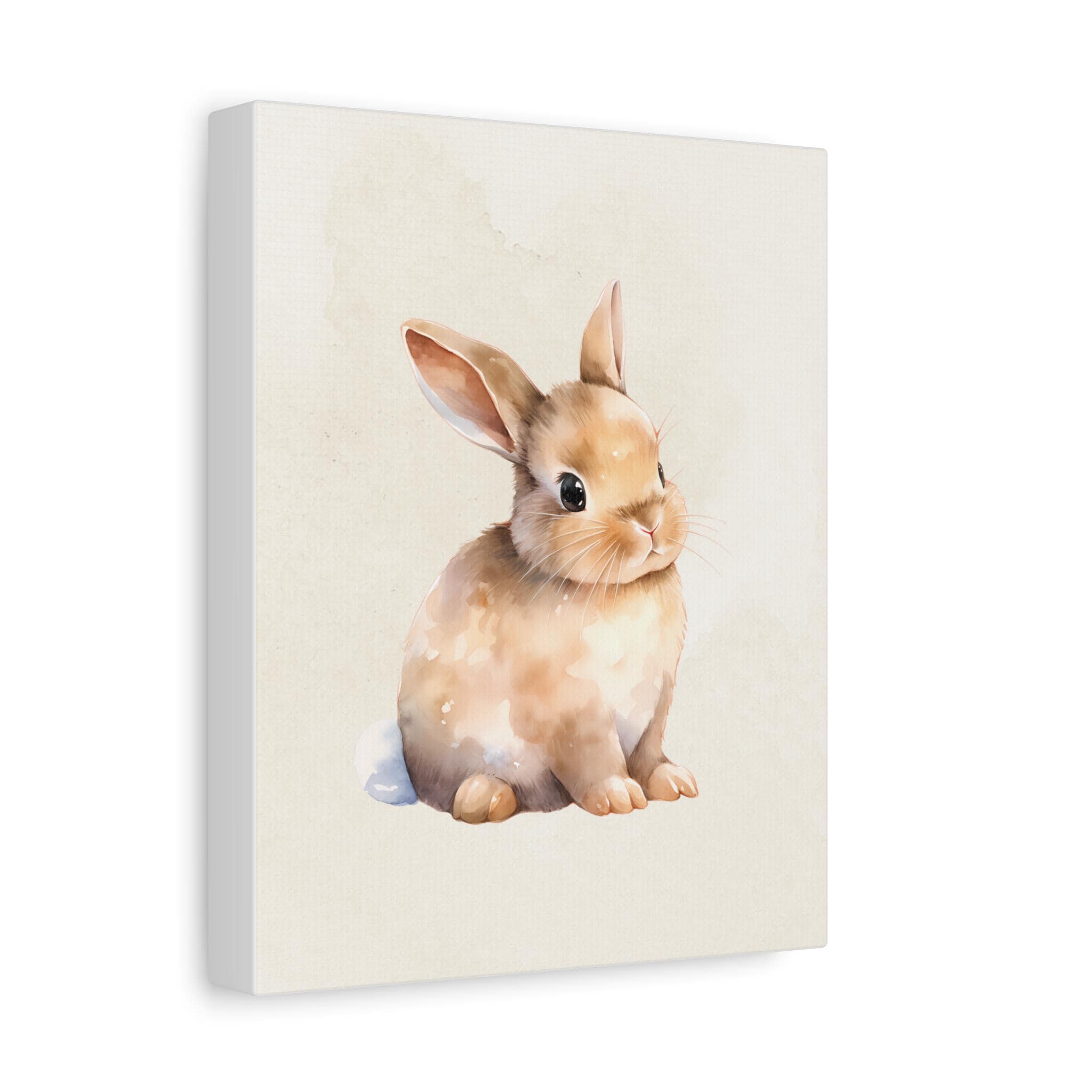 A softly painted baby rabbit rendered in warm watercolor tones, printed on a matte stretched canvas that feels like a page from a well-loved storybook. The gentle cream background keeps the focus on the rabbit’s curious face and velvety fur, bringing a calm, tender energy to nurseries, reading corners, or cozy gallery walls. Hung with the included back hardware and held steady by soft rubber dots, this lightweight canvas adds a quiet, comforting presence to rooms where simplicity and warmth matter most.