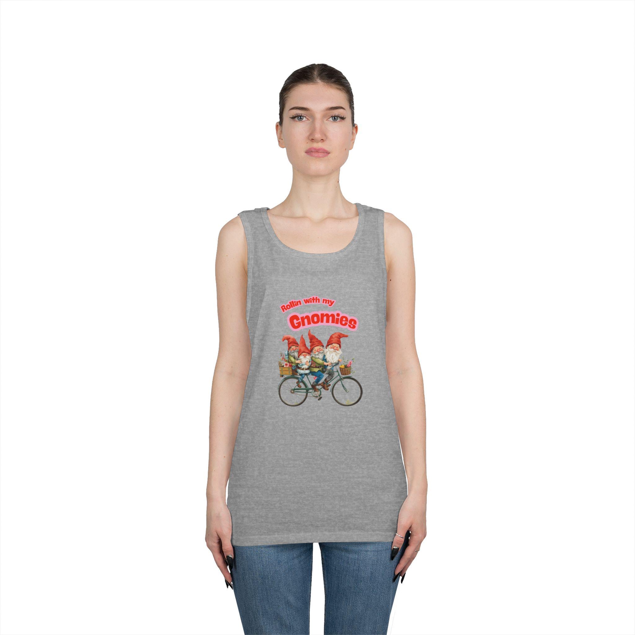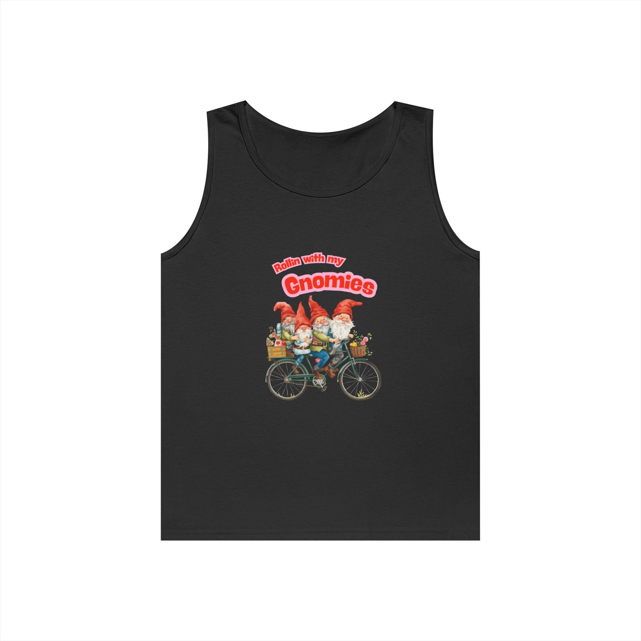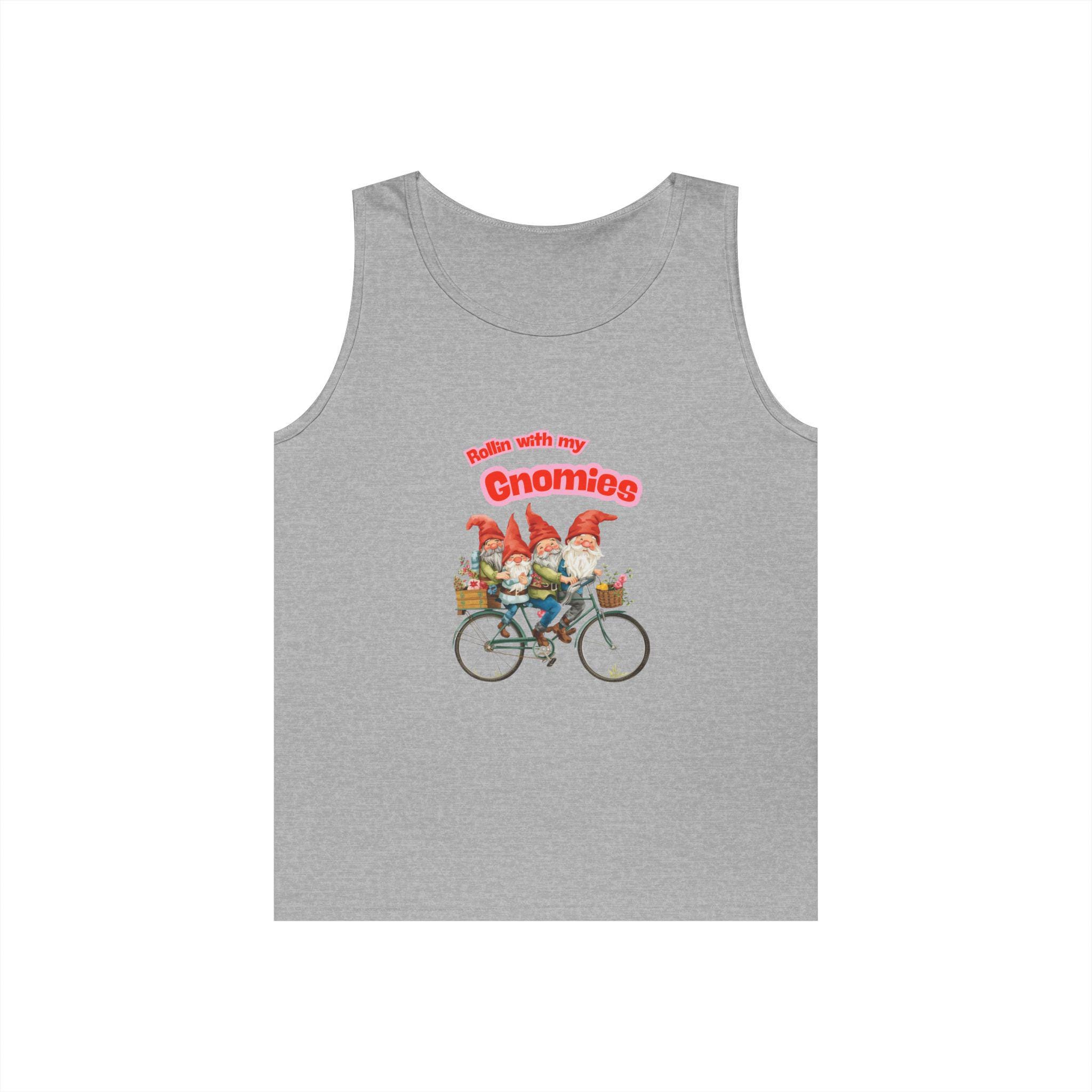 This lightweight tank brings a playful, woodland spirit to warm-weather days. A cluster of cheerful gnomes rides a vintage bicycle across the chest, their bright hats and tiny details drawing the eye and sparking a smile. The classic fit and medium-weight cotton knit keep the silhouette relaxed and breathable — great for slow morning coffee rides, picnics at the park, or afternoons pottering in the garden. Colors are vivid against the soft fabric, and the tear-away label keeps the back of the neck comfortable. Wear it layered under a flannel or on its own when you want an uncomplicated, whimsical touch to your everyday look.