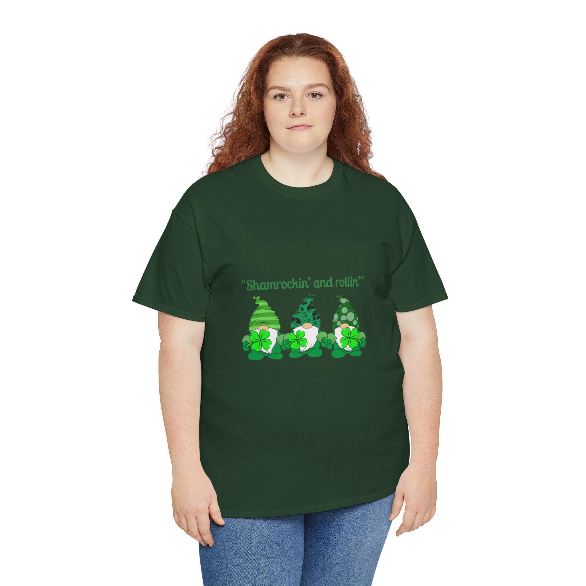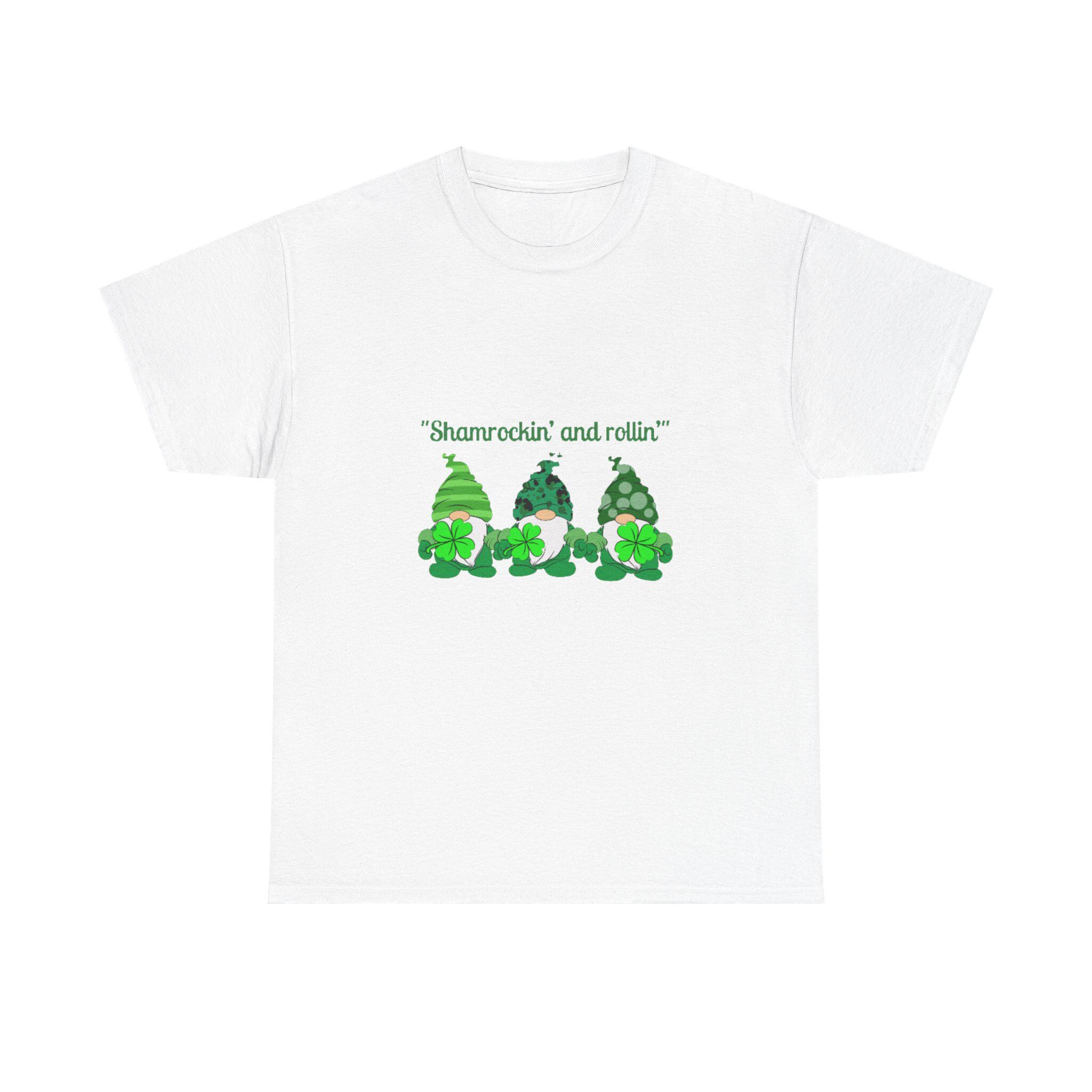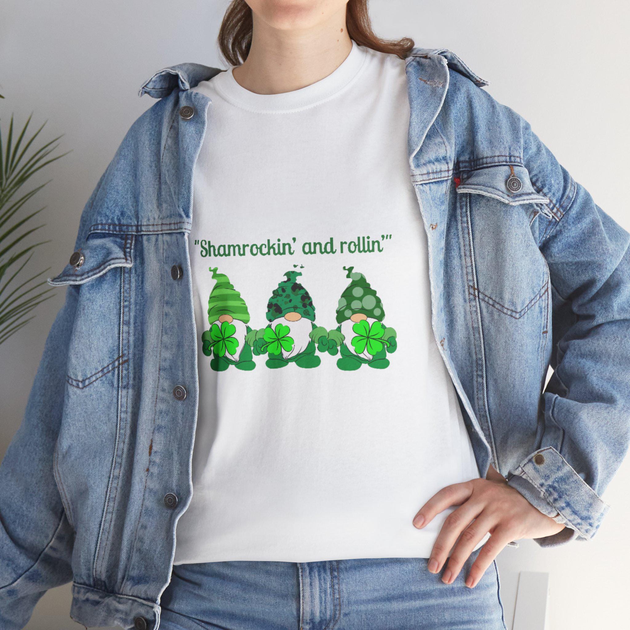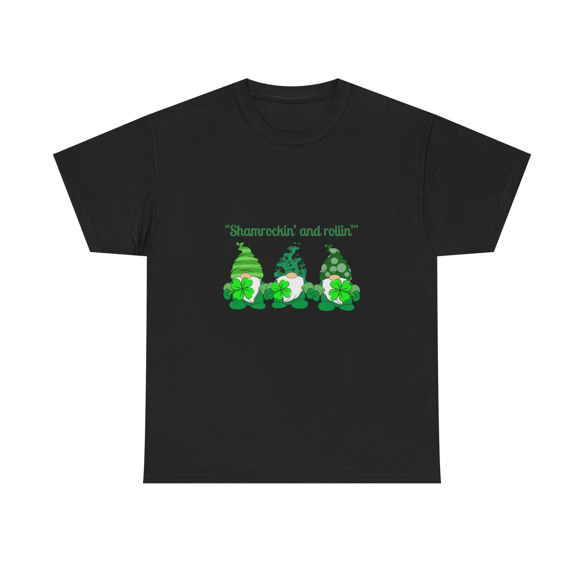 A soft, sturdy cotton tee that brings a playful St. Patrick’s Day vibe to casual days. Three cheerful green gnomes—each patterned differently with stripes, polka dots, and shamrock motifs—stand side by side across the chest beneath the whimsical line “Shamrockin’ and rollin’.” The classic crew neckline and relaxed fit sit comfortably for all-day wear, while the smooth-print surface keeps the artwork bright and detailed. Wear it to pub crawls, neighborhood parades, or cozy gatherings to add a lighthearted, festive touch to your outfit.