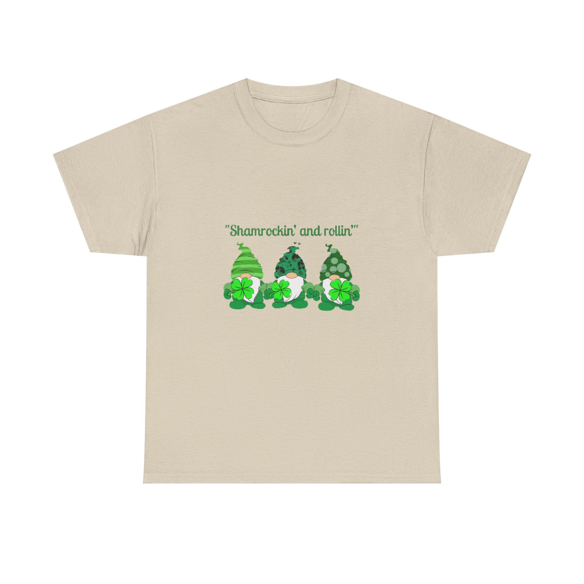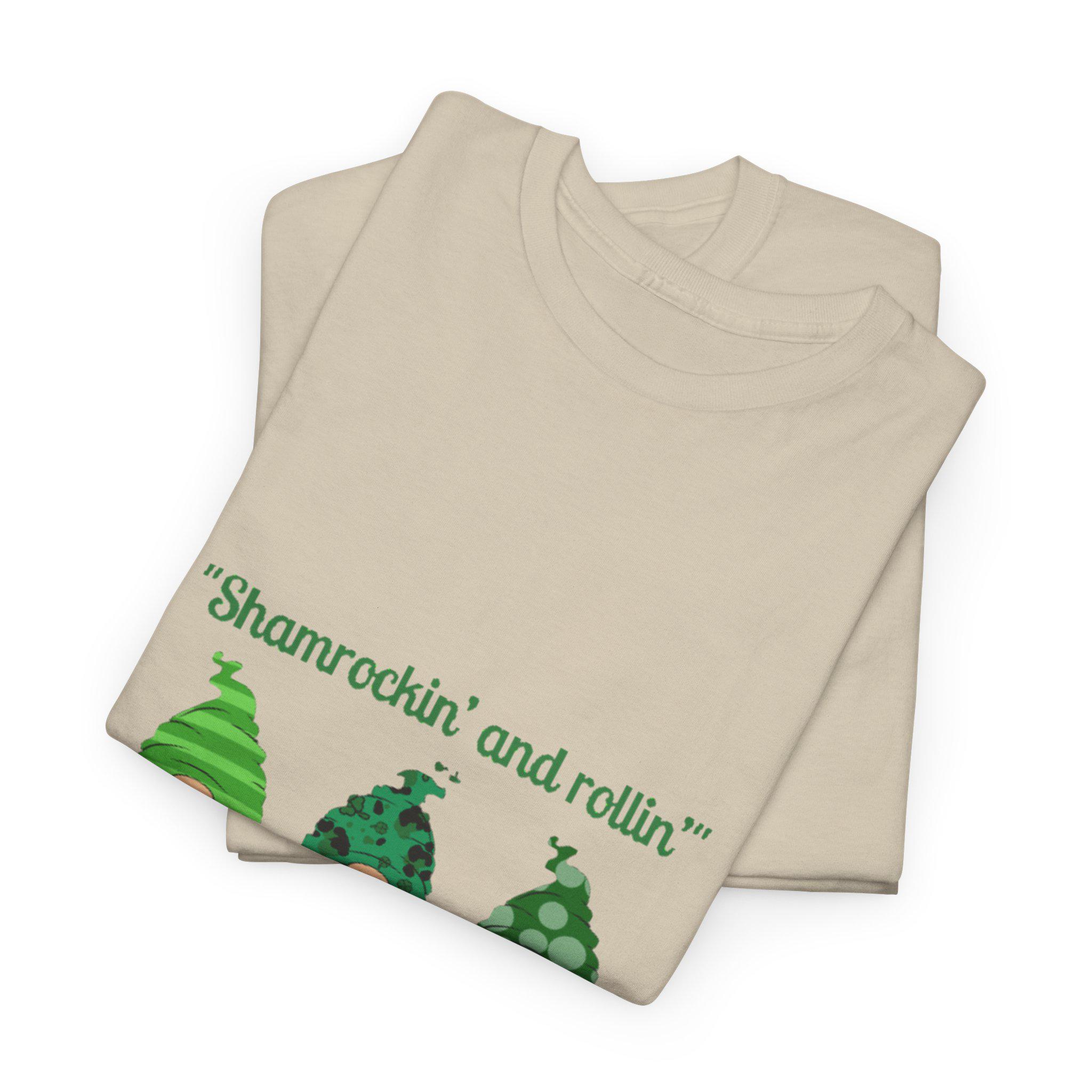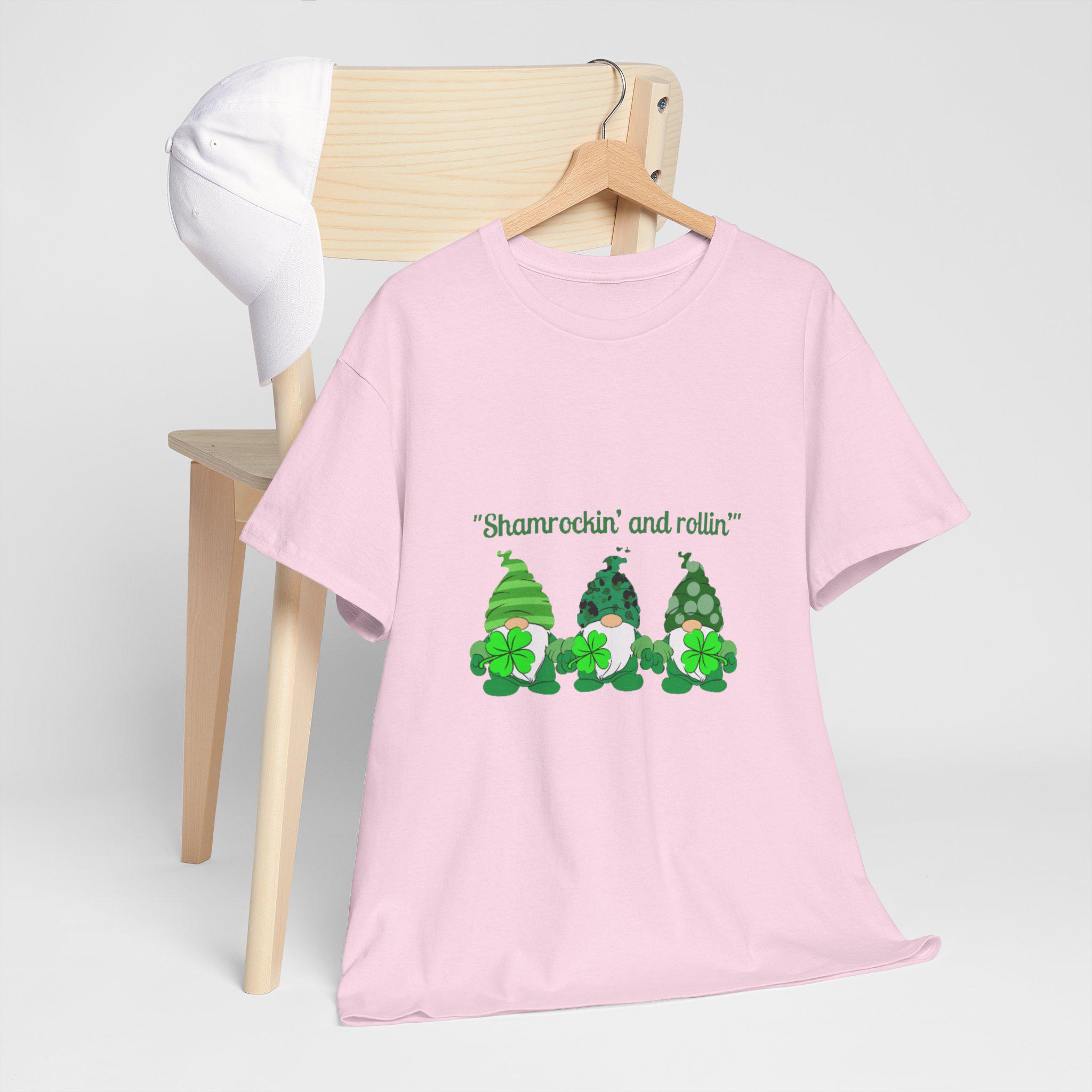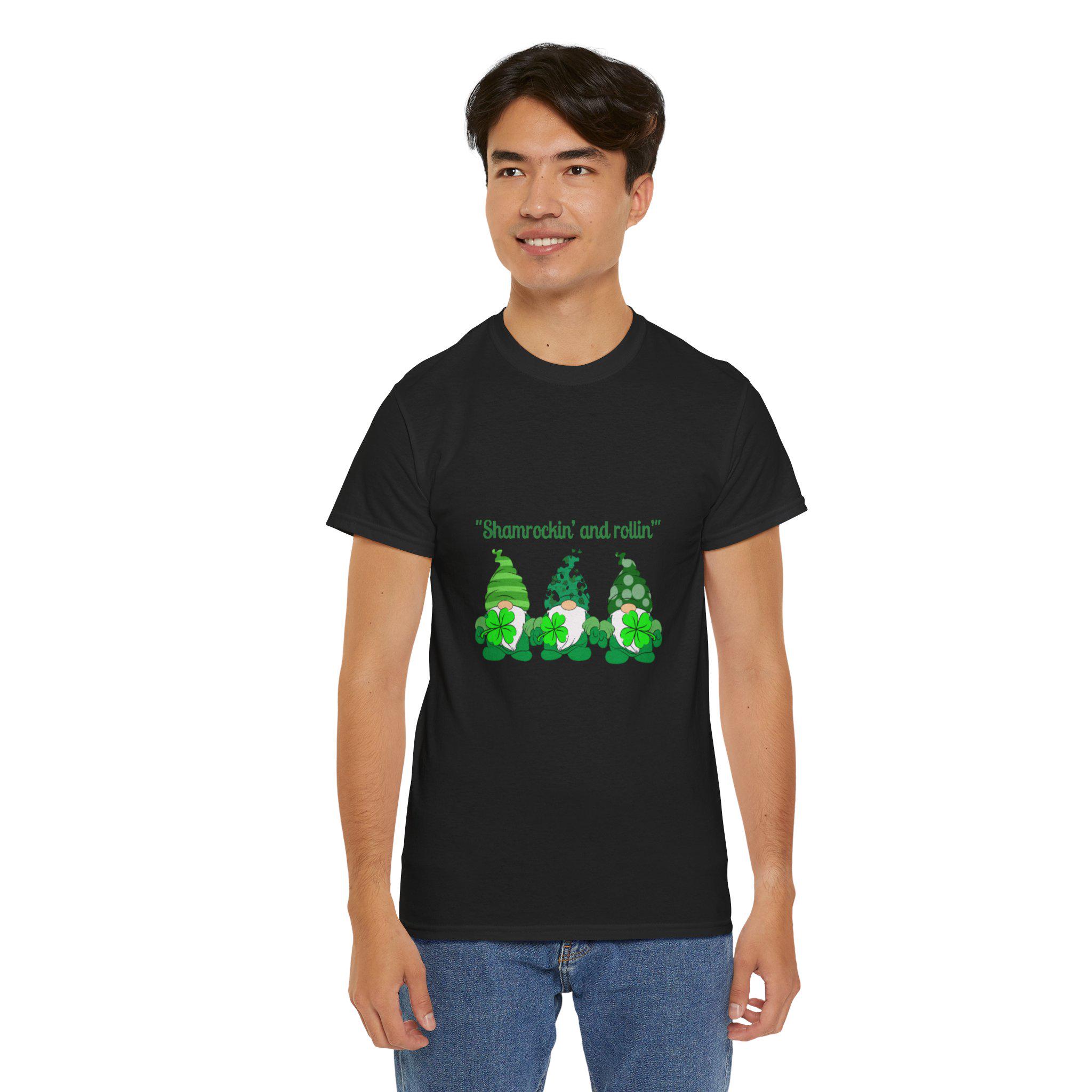 A soft, sturdy cotton tee that brings a playful St. Patrick’s Day vibe to casual days. Three cheerful green gnomes—each patterned differently with stripes, polka dots, and shamrock motifs—stand side by side across the chest beneath the whimsical line “Shamrockin’ and rollin’.” The classic crew neckline and relaxed fit sit comfortably for all-day wear, while the smooth-print surface keeps the artwork bright and detailed. Wear it to pub crawls, neighborhood parades, or cozy gatherings to add a lighthearted, festive touch to your outfit.