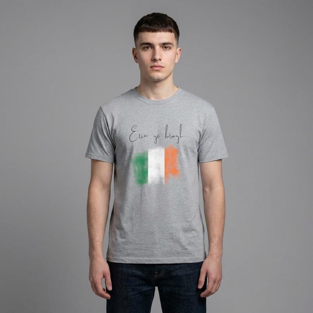 Soft, light, and quietly proud — this crewneck tee carries a gentle nod to Irish roots with two watercolor brushstrokes in green and orange and a delicate handwritten sentiment above. The airy 153 g/m² ring-spun cotton feels breathable against skin, so the shirt slips easily into weekend walks, coffee runs, or low-key gatherings. It wears like a familiar favorite: the collar holds its shape, the shoulders stay crisp, and the tear-away label keeps things comfortable. Subtle and understated, it’s for anyone who wants to carry a whisper of homeland and memory without shouting it aloud.