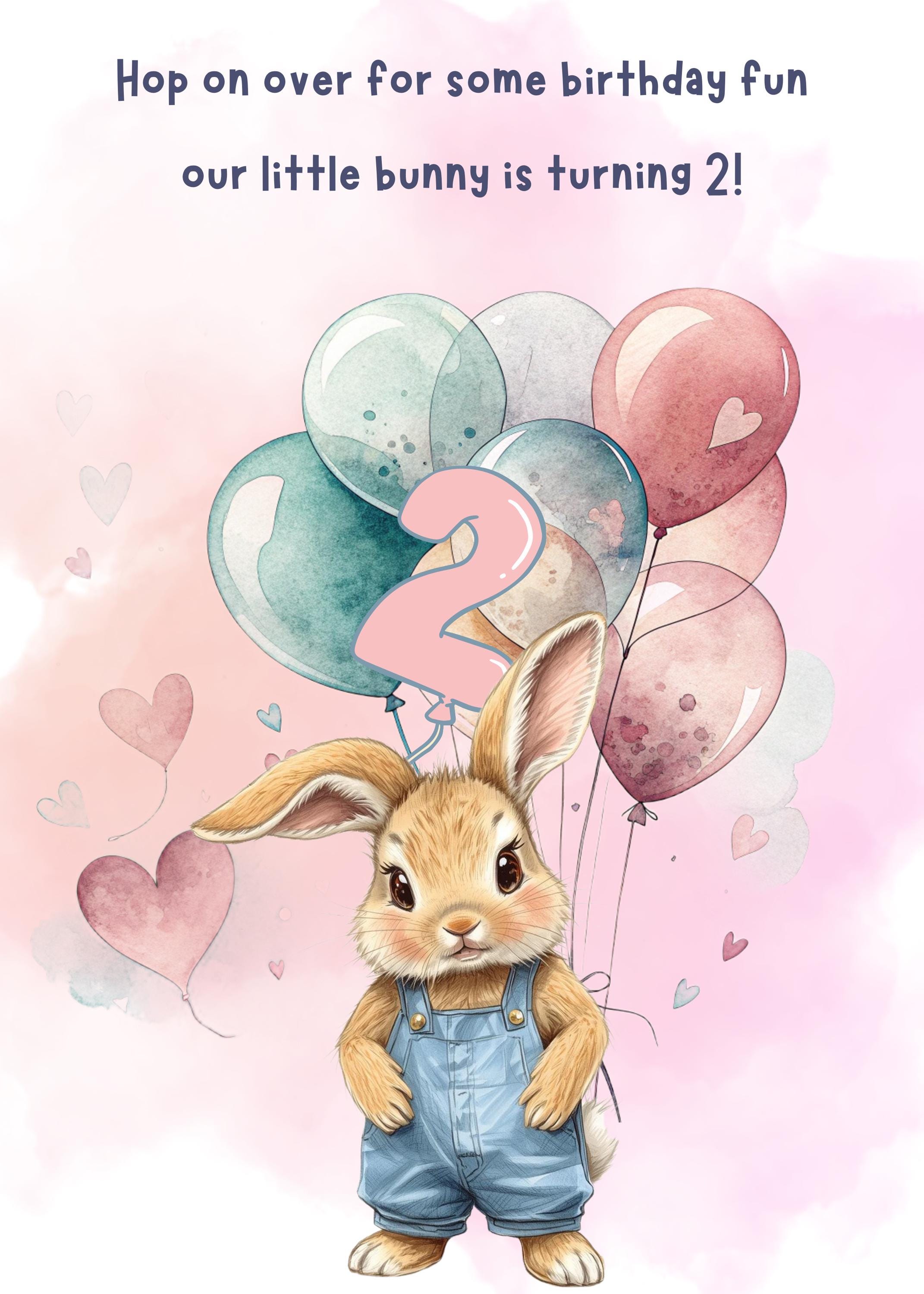 Celebrate your little one’s special day with this adorable bunny-themed 2nd birthday invitation. Inspired by our “Hop on over for some birthday fun—our little bunny is turning 2!” design, this charming card features soft watercolor balloons, sweet pastel tones, and a playful bunny motif—perfect for a spring or garden-themed celebration.