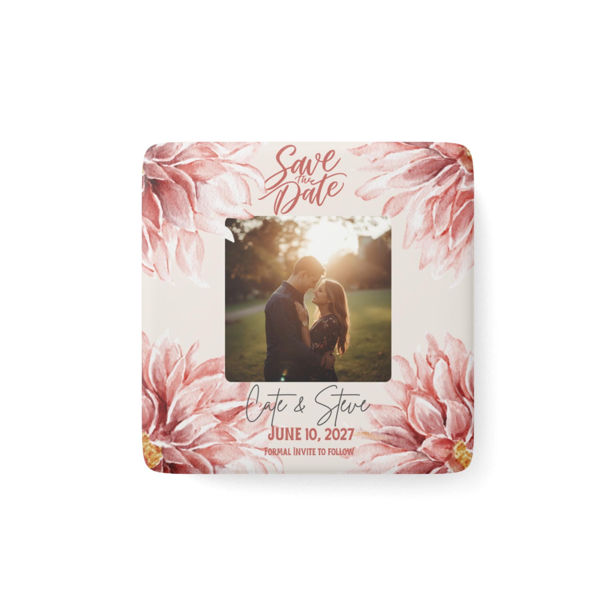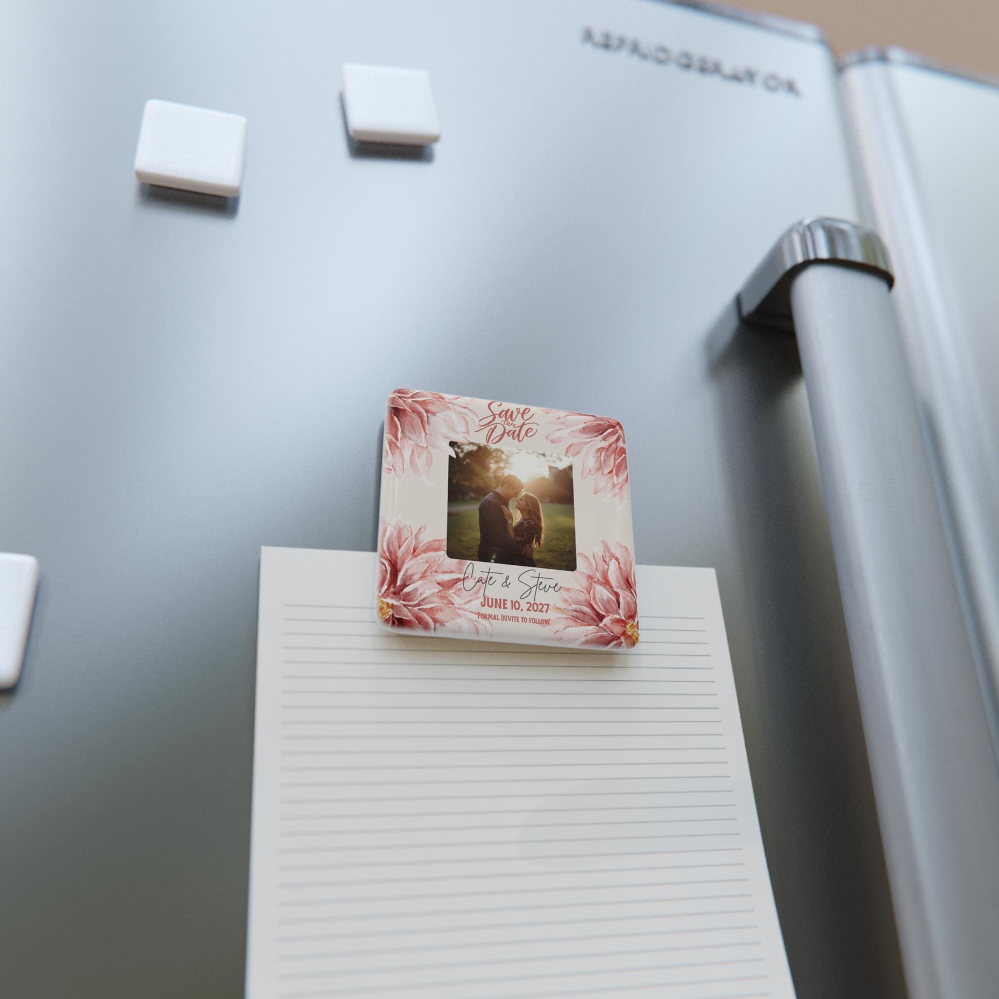 Catch a moment and keep it close to the kitchen table. This 2" square porcelain magnet carries a glossy, photo-ready surface that makes colors pop and delicate floral details sing. It holds a tiny square photo framed by soft pink blooms and hand-lettered script — an intimate keepsake for wedding dates, anniversary reminders, or a sweet everyday nudge of a treasured memory. The magnet sits flush on the back so it feels seamless on the fridge, locker, or magnetic board.