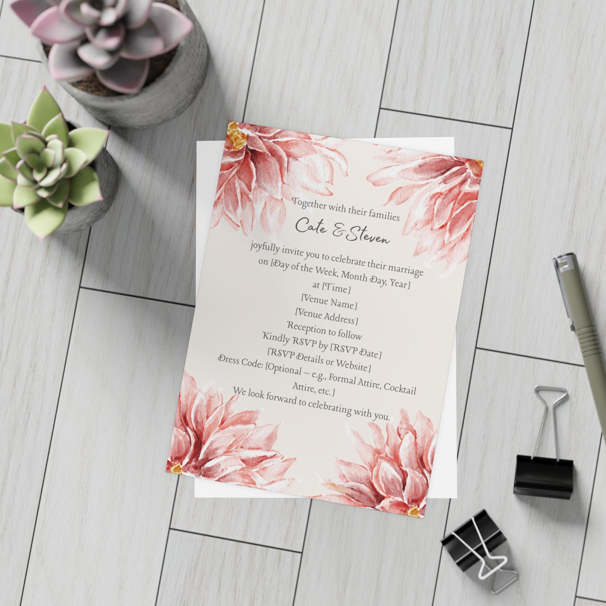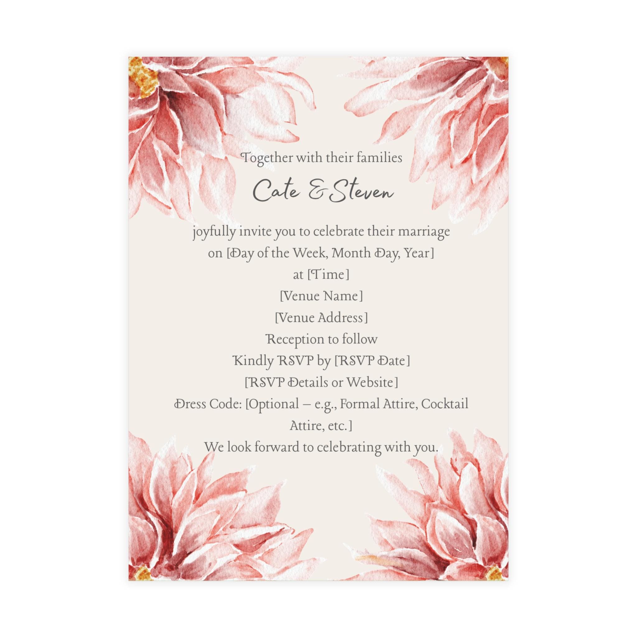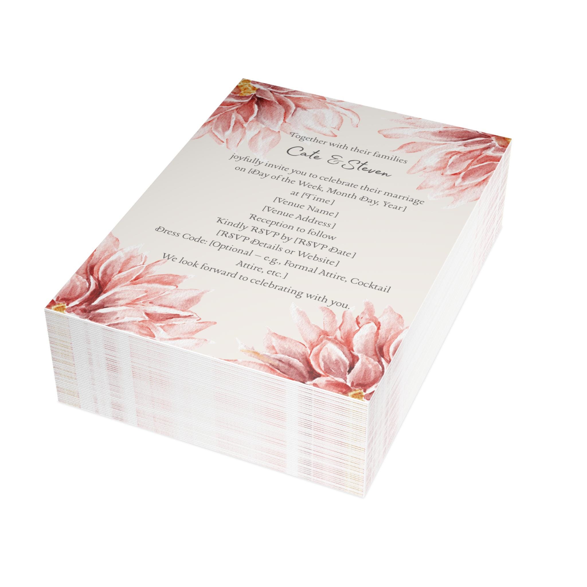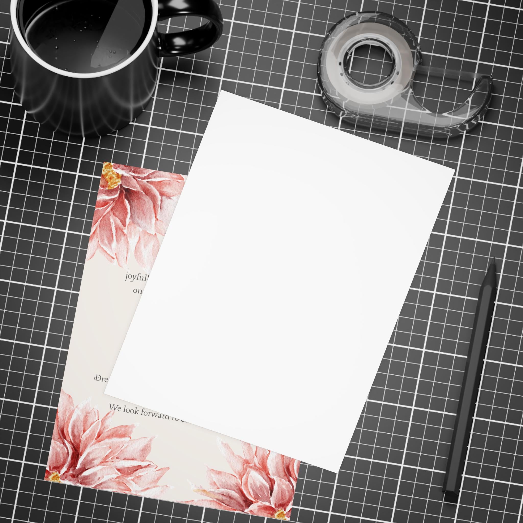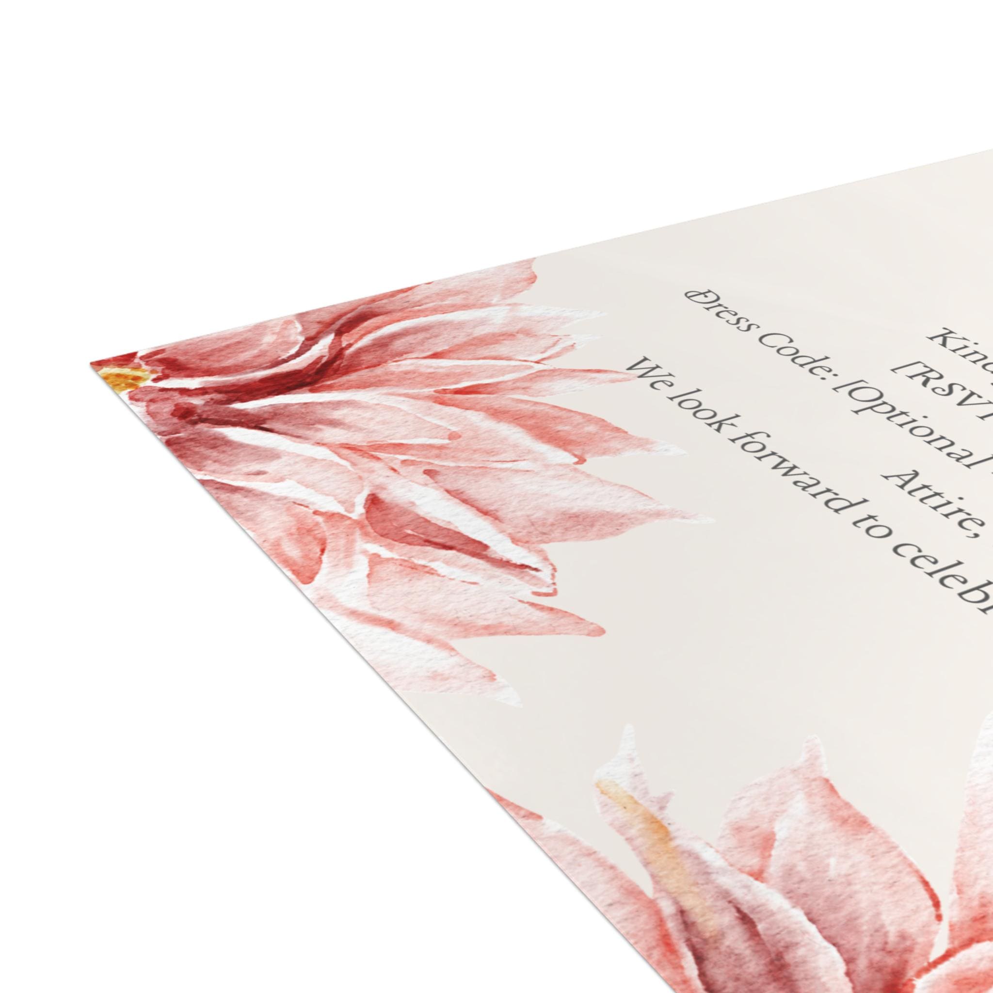 The Floral Wedding Invitation features a soft, romantic design highlighted by watercolor paintings of pink flowers. The floral artwork appears multiple times, creating a cohesive and elegant botanical theme. The text layout is clean and centered, with the couple’s names standing out prominently. The typography is likely a mix of graceful script for names and simple serif or sans-serif fonts for event details, balancing sophistication with readability. The overall style conveys warmth and celebration, making it ideal for printing 50 pieces for a refined and intimate wedding event. Available in 4 sizes and 4 paper finishes (matte, uncoated, one-side coat, two-side coat), these custom postcards are a perfect canvas for you to create a truly personalized experience. Available in bundles of 10, 30, and 50 pieces.